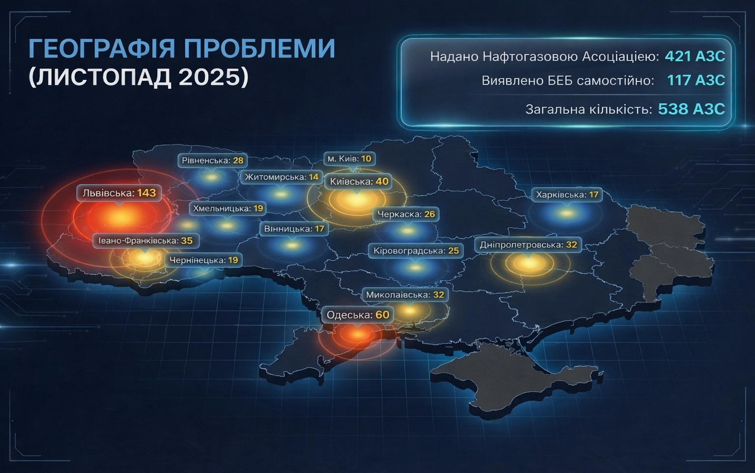 Показники на карті відображають регіональний розподіл виявлених проблемних об’єктів станом на листопад 2025 року. Саме у цей період БЕБ розпочало системну роботу з нелегальними АЗС.