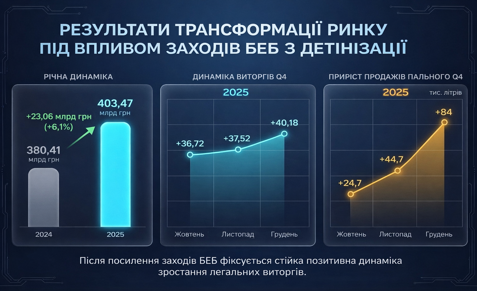 У 2025 році зафіксовано зростання легальних виторгів з 380,41 млрд грн у 2024 році до 403,47 млрд грн у 2025 році, що становить +23,06 млрд грн (+6,1%).