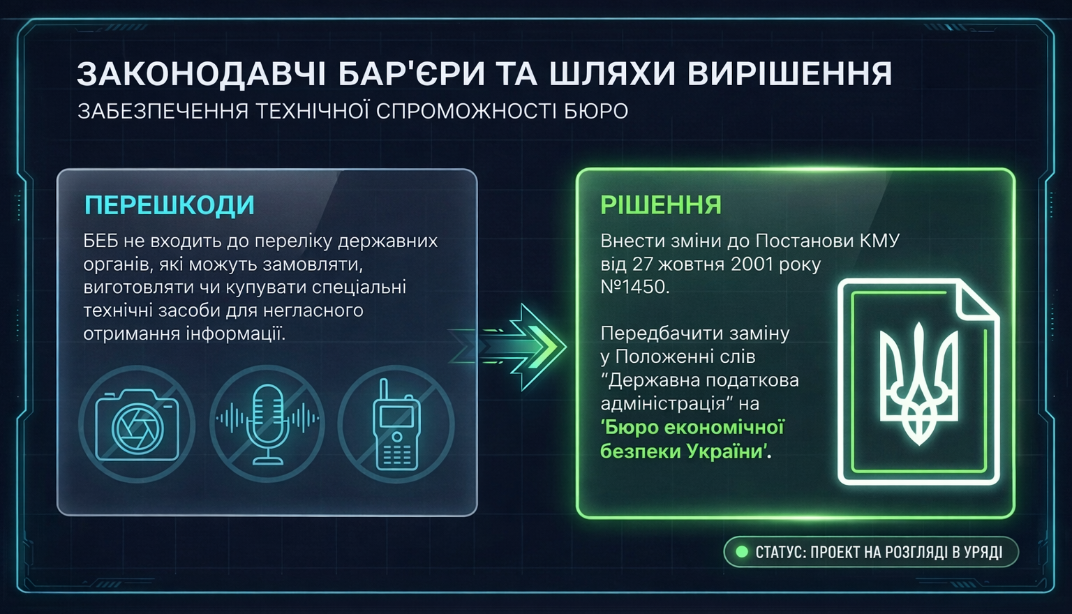 Відповідно до чинного законодавства всі правоохоронні органи наділені повноваженнями щодо використання спеціальних технічних засобів для негласного отримання інформації. Після прийняття Закону України «Про Бюро економічної безпеки України», не були внесені зміни до постанови КМУ від 27 жовтня 2001 року № 1450 та право використання спеціальних технічних засобів залишилося у ДПА України. Відсутність цих змін критично впливає на спроможність БЕБ здійснювати негласні слідчі дії.